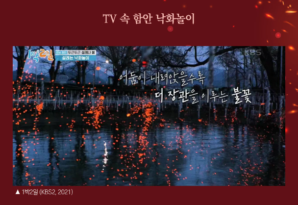 함안 낙화놀이는 이제 TV 예능 프로그램이나 드라마, 뮤직비디오에도 자주 등장하여 그 인지도가 높아지고 있습니다. 덕분에 지역의 문화유산을 널리 알리고 많은 관광객이 이 아름다운 전통을 직접 만나보고자 함안을 방문합니다. 또한 마을 공동체의 안녕과 단결을 도모하는 중요한 축제로 자리 잡으며, 현대와 전통이 조화를 이루는 성공적인 사례가 되고 있습니다.