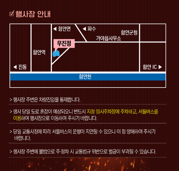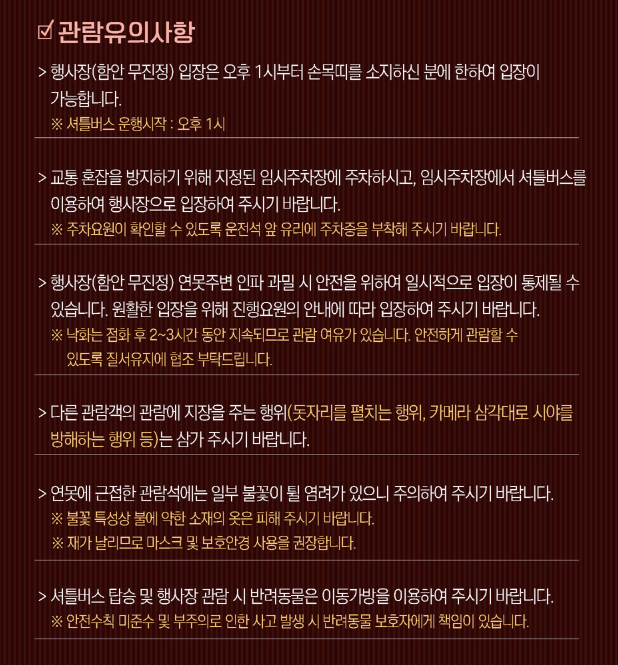 불꽃 축제는 안전이 최우선입니다. 축제장을 방문하시는 모든 분께서는 축제 운영 요원의 안내에 잘 따라주시고, 안전선 안에서 축제를 즐겨주시길 바랍니다. 아름다운 함안 낙화놀이를 더욱 편안하고 안전하게 감상하기 위해 관람객들의 협조가 절대적으로 필요합니다.