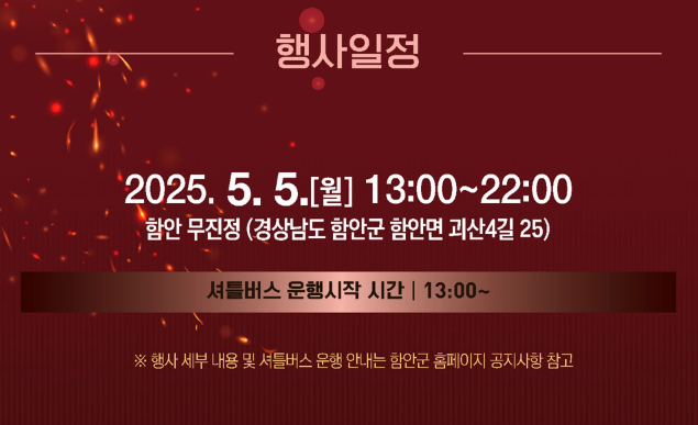 따뜻한 봄바람과 함께 밤하늘을 수놓는 장엄한 불꽃, 전통의 아름다움을 간직한 함안 낙화놀이가 올해도 여러분을 기다립니다. 경상남도 함안에서 매년 4월 초파일이면 펼쳐지는 이 전통 축제는 지역의 안녕과 풍년을 기원하는 뜻깊은 민속놀이입니다. 화려한 불꽃이 떨어지듯 흐르는 모습은 하늘이 내리는 꽃비와 같습니다. 과연 이 축제는 어떤 이야기를 담고 있을까요? 단 하루만 진행하는 축제이기 때문에 예약경쟁이 치열합니다. 바로 예약하실 분은 아래 안내를 확인하세요.
