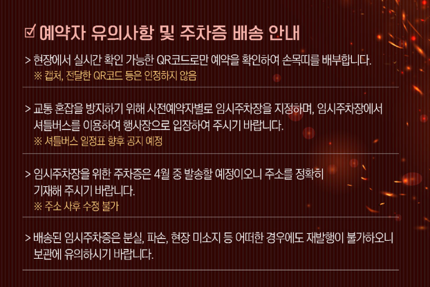예약 시 반드시 정확한 주소를 입력해야 하는데, 축제에 필요한 손목띠가 입력된 주소로 배송되기 때문입니다. 주차가 제한된 관계로 차량 진입이 불가능하므로 임시 주차장에 차를 세운 후 셔틀버스를 이용하는 것이 편리합니다.